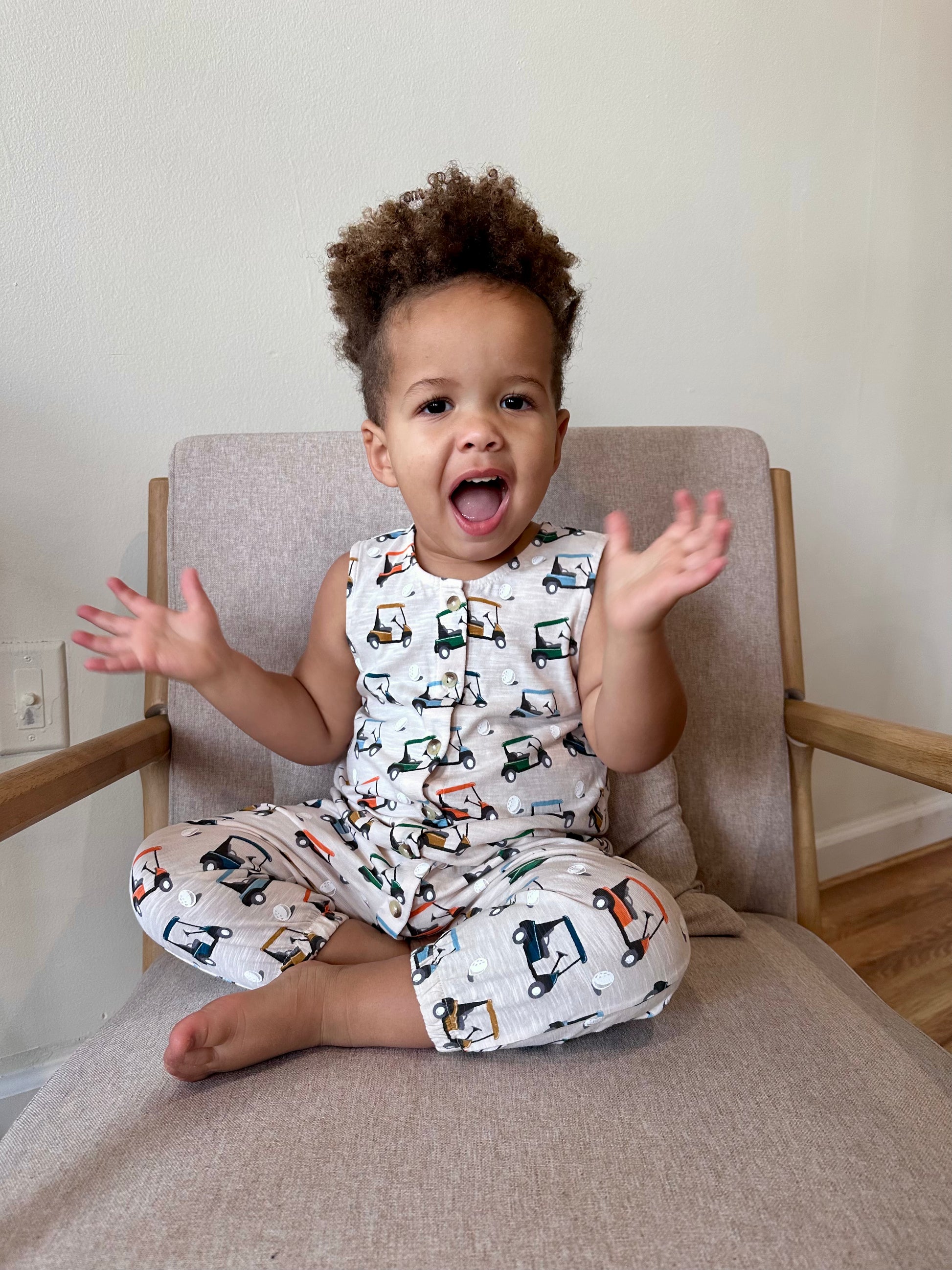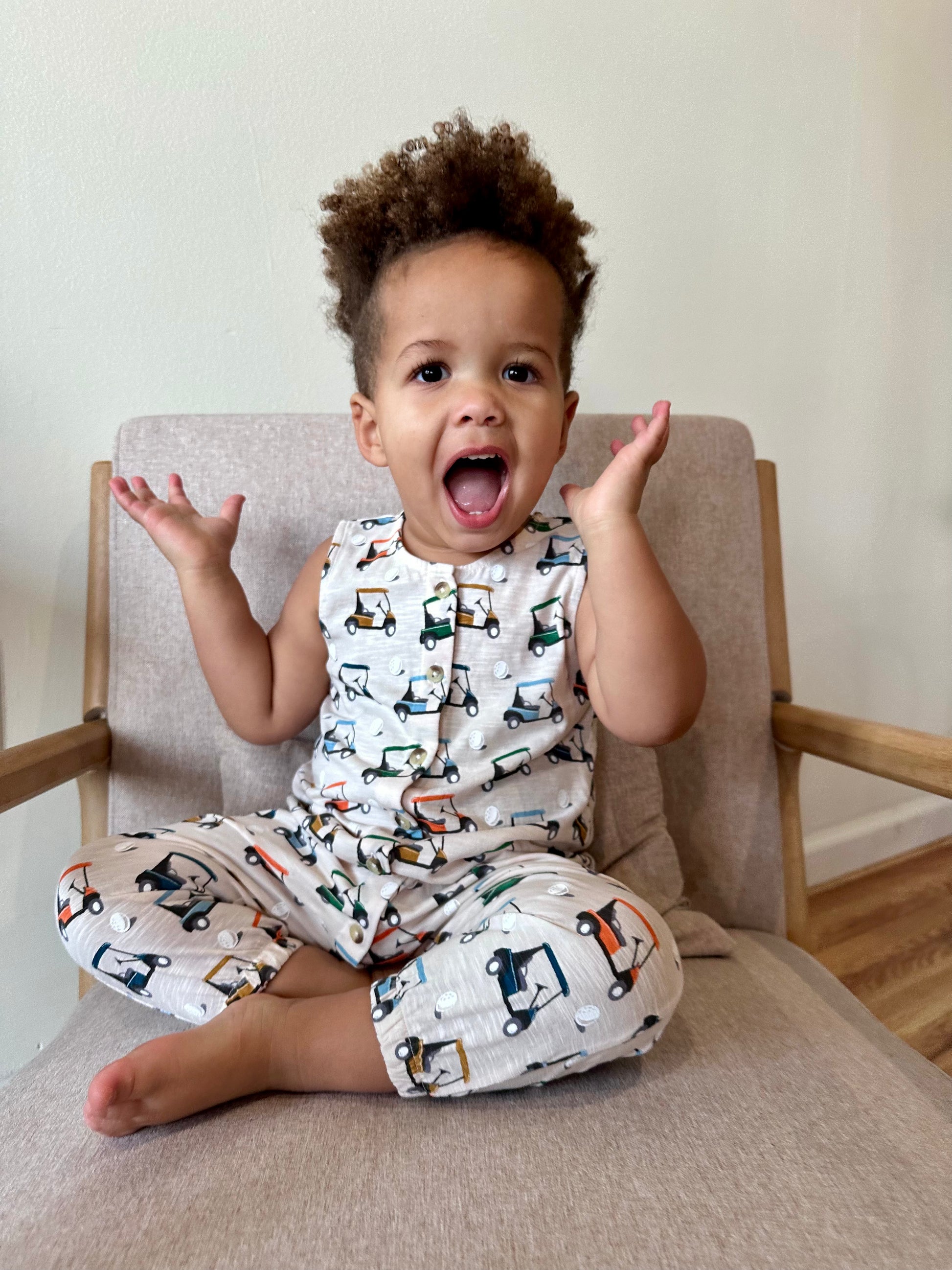 Get your little one ready for a day of fun in this adorable Golf Cart Baby Romper!